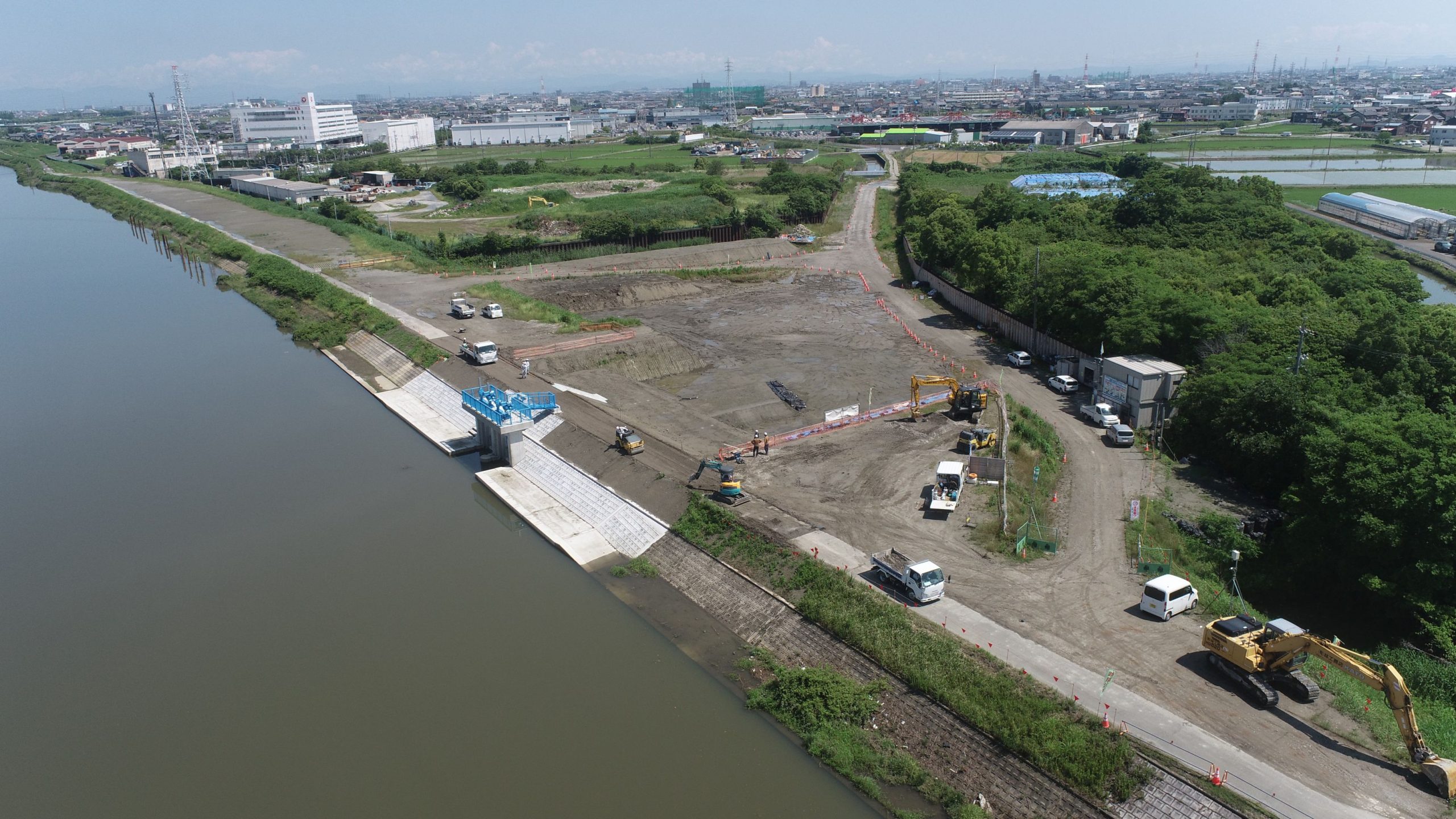 本工事は、新しい排水機場の建設に伴い、排水機場から日光川に放流する樋門・樋管の築造を行います。